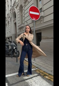 • Béžový trenčkot přes tmavou denimovou blůzu a rozšířené džíny; džíny mají přední rozparky; černá kabelka; městské prostředí se silniční značkou.