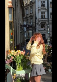 • Žlutý pletený svetr, šedá skládací sukně a malá žlutá kabelka. Obklopena tulipány a dalšími květinami na tržním prostředí.