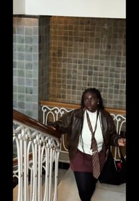 • Hnědá kožená bomber bunda, bílý pletený svetr, pruhovaná kravata, vínová mini sukně, černé punčocháče, držící černou tašku přes rameno. Pozadí s mramorovým schodištěm.