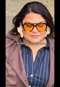• Hnědá bunda přes modrou pruhovanou košili, doplněná hnědými kalhotami. Sluneční brýle mají žlutý odstín. V pozadí jsou kamenné schody a texturovaná zeď.