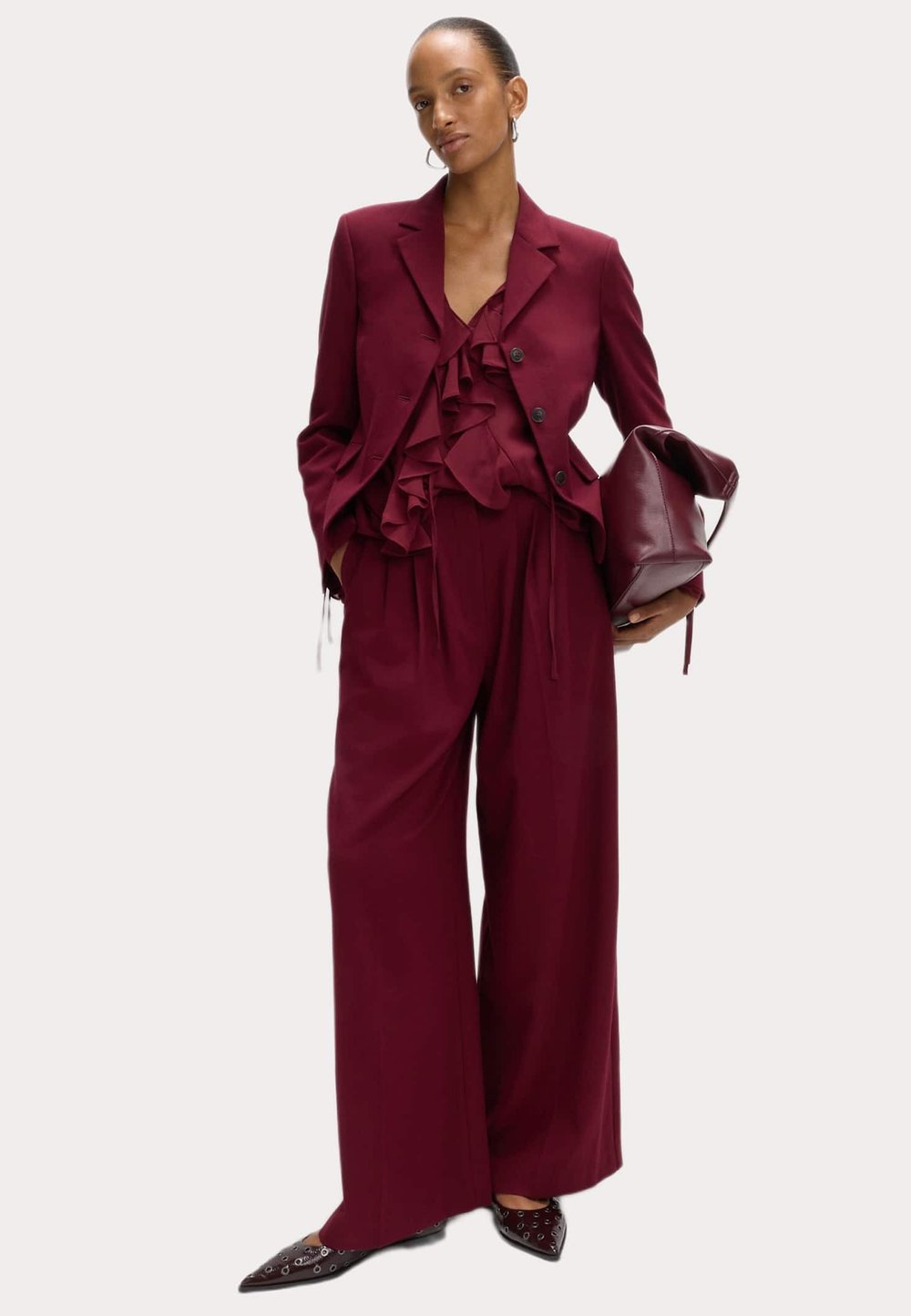 Červená blůza bez ramínek s volány, černé široké kalhoty, špičaté černé podpatky a černá kabelka. Hladké textury a kontrastní barvy.