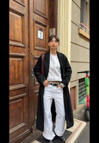 • Černý dlouhý kabát, šedý svetr, bílé široké kalhoty, černý opasek a černé kotníkové boty. Dřevěné dveře s panelovými detaily v pozadí.