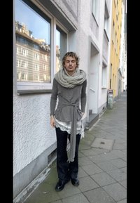 • Muž s kudrnatými vlasy, který má na sobě hrubě pletený šál, šedou košili s páskem přes halenku s krajkovým lemem a kostičkovaným vzorem, černé kalhoty, stojící na městském chodníku.