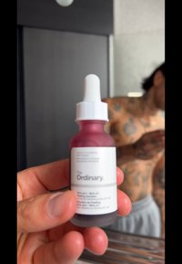 • Ruka držící lahvičku The Ordinary AHA 30% + BHA 2% Peeling Solution se zaostřeným tetováním na torzu v pozadí.