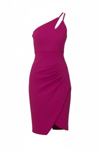• Přiléhavé jednodílné šaty na jedno rameno v živě modré tkanině, délka po kolena s hladkou texturou. Nošené s černými špičatými podpatky a malou černou kabelkou.