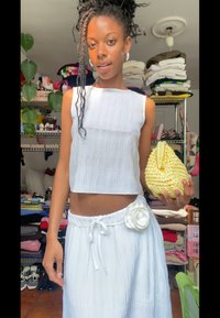 • Bílý dvoudílný outfit s krátkým topem a dlouhou sukní, vyrobený z texturované látky, s volánkovým lemem a dekorativní šňůrkou v pase.