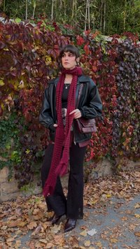 • Červený pletený šátek, černá kožená oversize bunda, přiléhav�é černé krajkové kalhoty s rozšířenými nohavicemi, pásek se stříbrnými detaily a vínová kabelka s klopou.