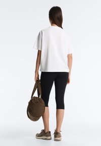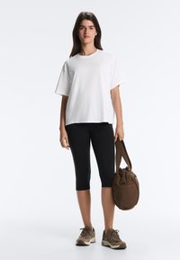 Mladá žena s dlouhými hnědými vlasy, oblečená v volném bílém tričku a černých kalhotách, stojící na jednoduchém světlém pozadí.