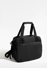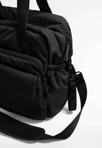 Černá polstrovaná taška s dvojitými horními rukojetmi a nastavitelným ramenním popruhem. Obsahuje několik vnějších kapes a hlavní přihrádku na zip.