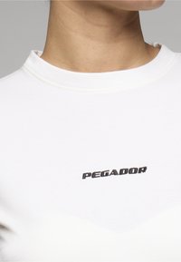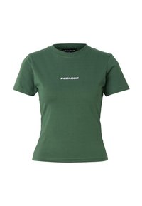 Žena s tmavými vlasy v bílém tričku s krátkým rukávem s nápisem "PEGADOR", oblečená v zelených kalhotách, stojící před jednoduchým světlým pozadím.