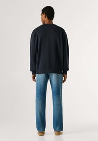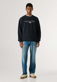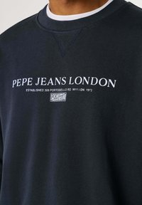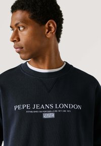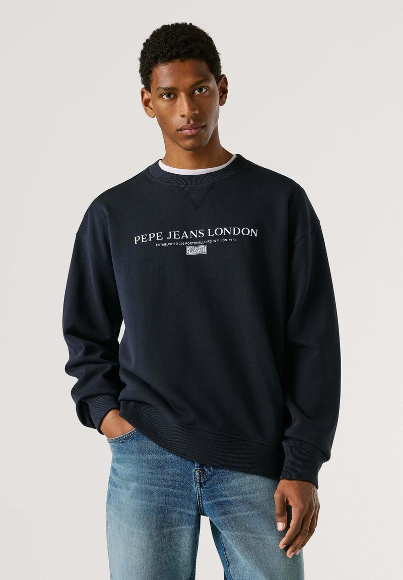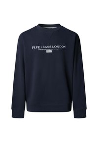 Námořnická mikina s bílým nápisem „PEPE JEANS LONDON“. Žebrované manžety a výstřih, měkká textura, volný střih. Nositelná s světle modrými džíny.