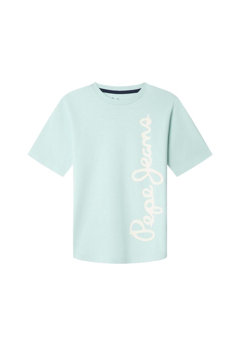 Světle modré bavlněné tričko s krátkými rukávy. Na přední straně je velký vertikální bílý textový nápis „Pepe Jeans“.