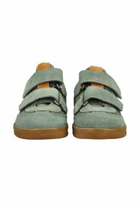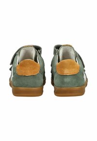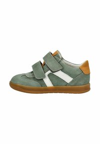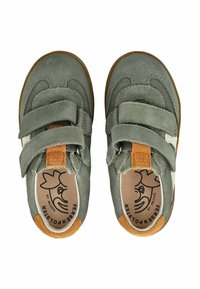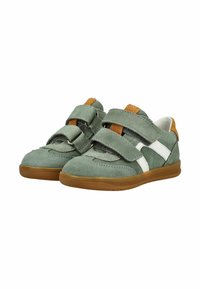 Dětská zelená semišová teniska s bílými bočními pruhy, hnědým zápatním záplatou, dvojitými pásky na suchý zip a podrážkou z přírodní gumy, zobrazená z bočního profilu.