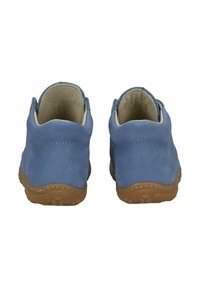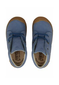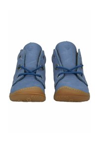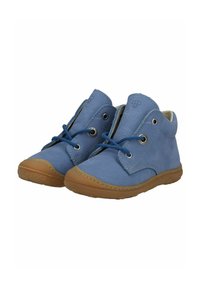 Dětská modrá kožená kotníková obuv se zavazováním vpředu a hnědou gumovou podrážkou, pohled ze strany.