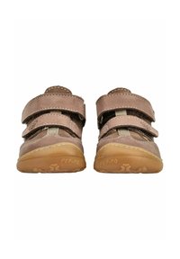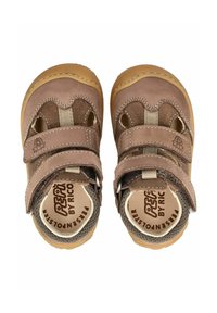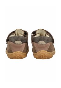 Hnědá semišová dětská sandálka se dvěma pásky na suchý zip, gumovou podrážkou a prodyšným síťovaným panelem na patě, zobrazená z boku.