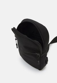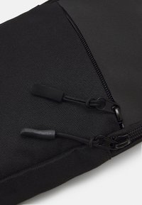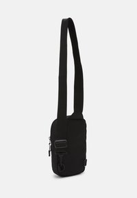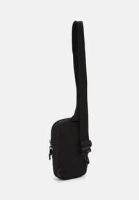 Kompaktní černá taška přes rameno s nastavitelným ramenním popruhem a přední kapsou na zip, zobrazena na jednobarevném bílém pozadí.