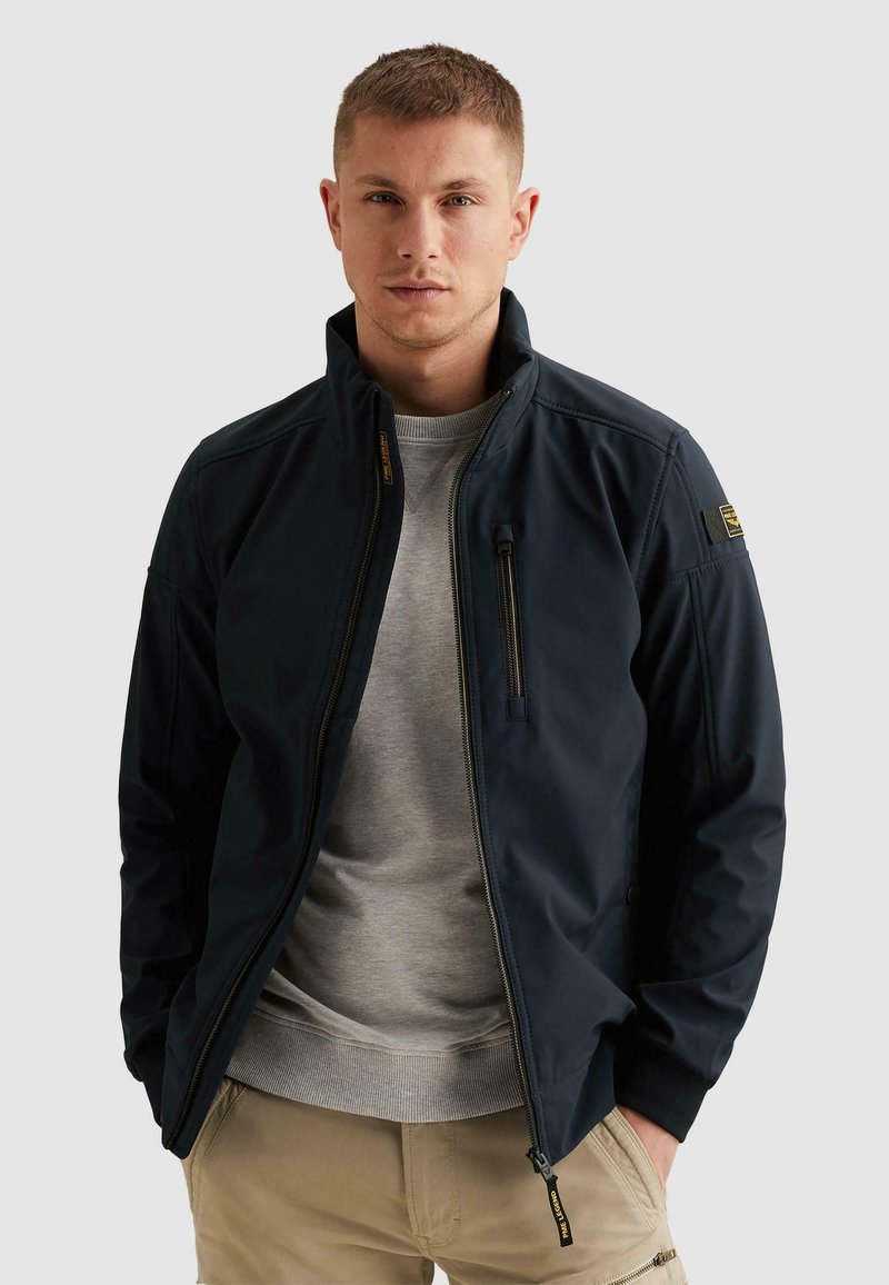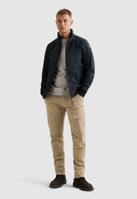 Mladý muž v tmavě modré bundě na zip přes světle šedou mikinu a béžové kalhoty, stojící s rukama v kapsách na jednobarevném pozadí.