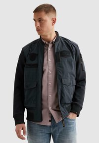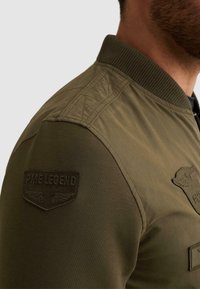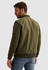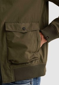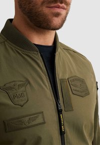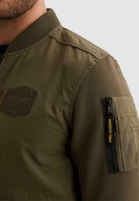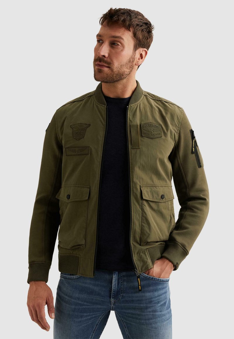 Muž v olivově zelené bombr bundě s nášivkami, černém tričku a modrých džínách, hledící stráně, s jednou rukou v kapse.