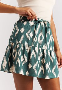 Zelená a bílá vícevrstvá sukně s ikatovým vzorem, se stahovacím pasem a texturovanou látkou. Kombinováno s lehkými žabkami.