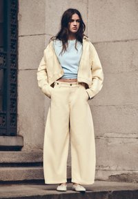 Osoba ve světle krémových širokých kalhotách s vysokým pasem, světle modrém krátkém topu, světle žluté bundě a bílých balerínách se zkříženými pásky.
