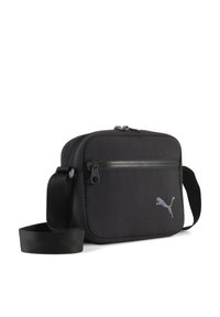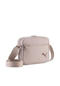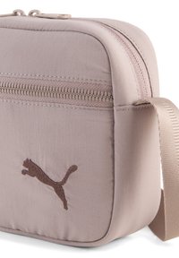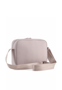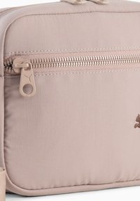 Světle růžová kabelka přes rameno se zipovým uzávěrem, s jemně vyraženým logem. Měkká, hladká textura s nastavitelným popruhem, nošená modelem.