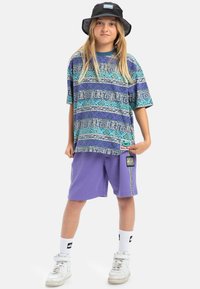Fialové kraťasy se bočními akcenty, vzorovaná oversized košile v modré a fialové, bílé tenisky a černý klobouk typu bucket s logem.