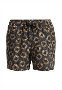 Černé plavkové šortky s žlutým květinovým vzorem, elastickým pasem se šňůrkou a volným střihem. Měkká textura látky.