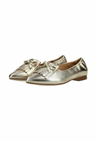 Metalická zlatá kožená balerína se špičatou špičkou, nízkým dřevěným podpatkem a ozdobnou mašlí s třásněmi nahoře.