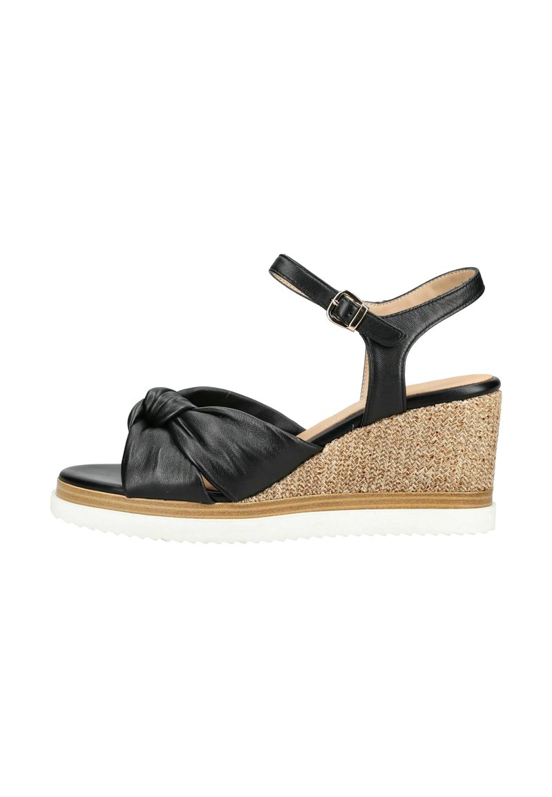 Černá kožená klínová sandála s uzlovaným předním páskem, přezkou u kotníku, klínovým podpatkem z tkaného juty a bílou vroubkovanou podrážkou.