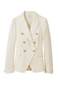 Černý dvouřadý blejzr se zlatými knoflíkovými akcenty, texturovaná tkanina, ostré klopy, doplněný černou saténovou košilí a černými kalhotami s vysokým pasem.