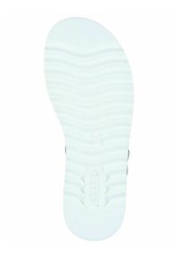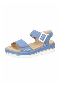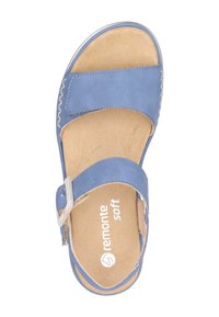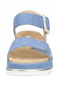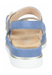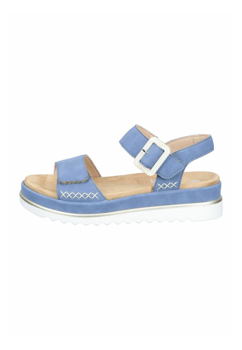 Modrá sandála s otevřenou špičkou, nastavitelné pásky, bílá spona, polstrovaná světle hnědá stélka, bílá vlnitá podrážka a dekorativní prošívání na páscích.