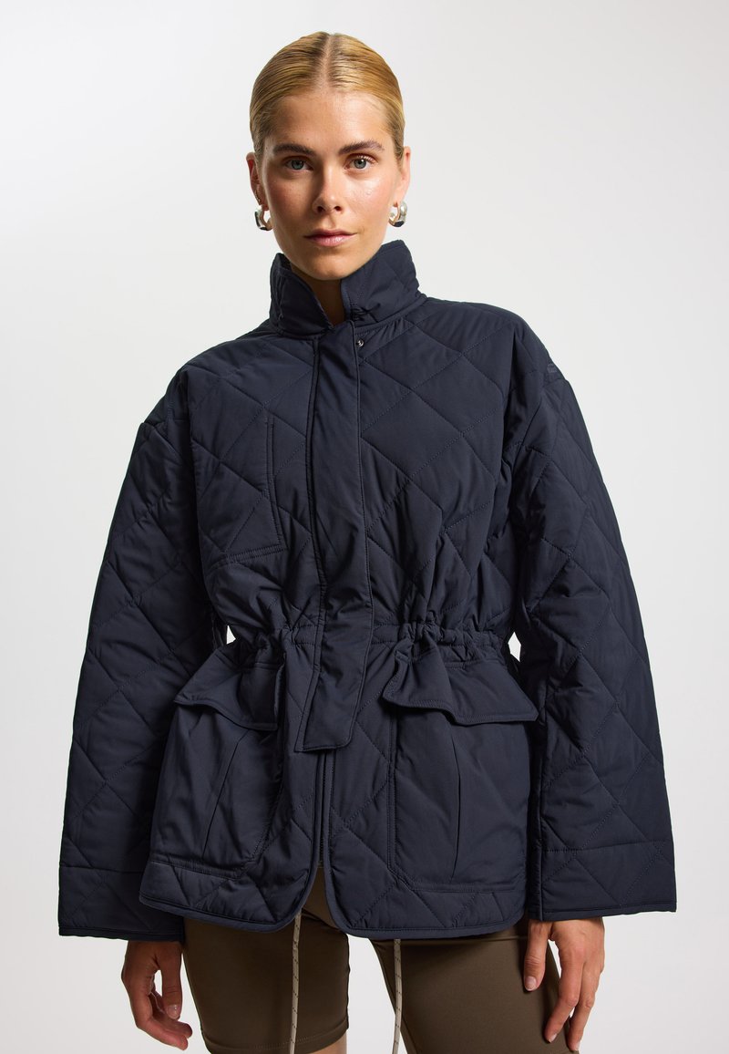 Tmavě modrá prošívaná bunda s vysokým límcem, staženým pasem a velkými kapsami. Má texturovaný svrchní materiál a volný, strukturovaný střih.