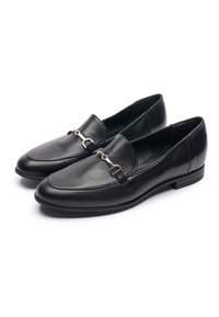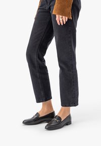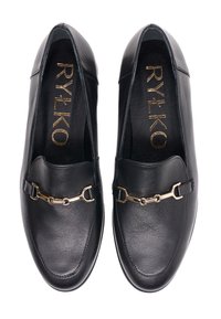 Černé kožené mokasíny se zlatými přezkami, nošené s krátkými černými džínami a hnědým prošívaným rukávem viditelným na bílém pozadí.