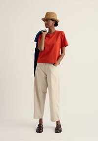 Žena s tmavými vlasy, která nosí zlaté kruhové náušnice, červené tričko s krátkými rukávy a béžové kalhoty, stojící na jednoduchém světlém pozadí.
