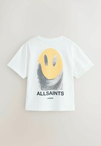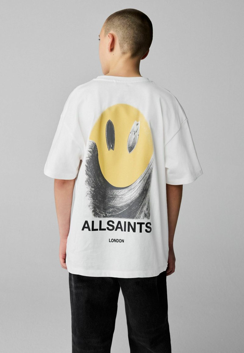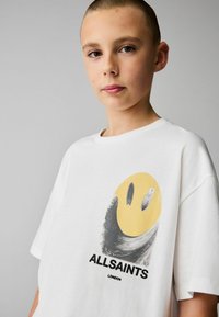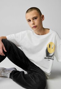 Mladá osoba s krátkými vlasy, oblečená v bílém tričku značky AllSaints s velkým žlutým smajlíkem a černým motivem na zádech.