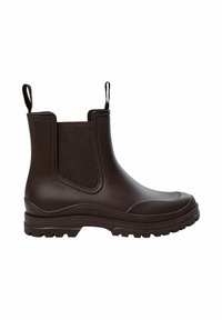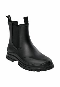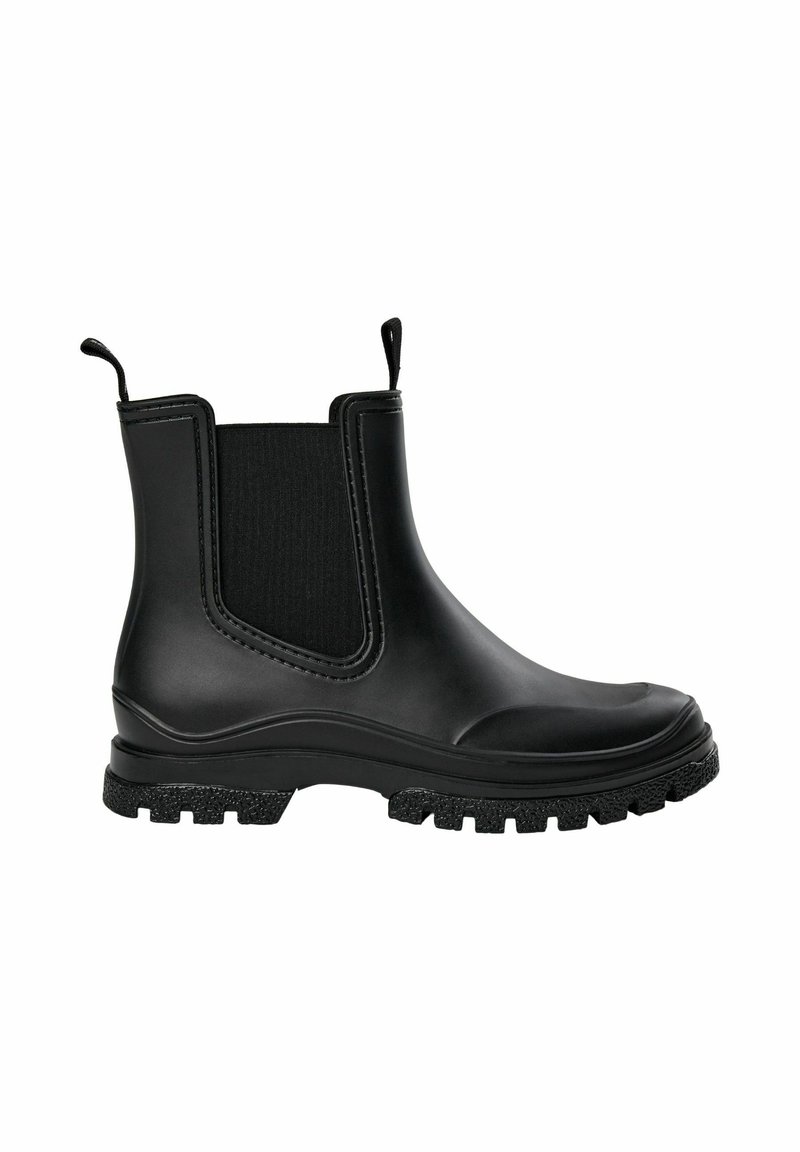 Černá gumová Chelsea bota s robustní podrážkou s výstupky, elastickými bočními panely a poutky vpředu i vzadu, zobrazená z bočního profilu.