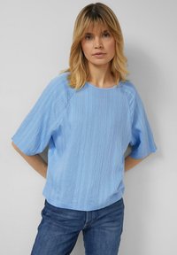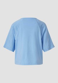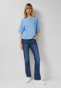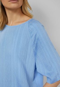 Blond žena v lehkém modrém texturovaném volném krátkém rukávu a modrých džínách stojící před jednobarevným světle šedým pozadím.