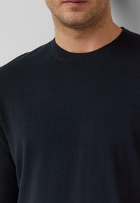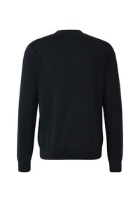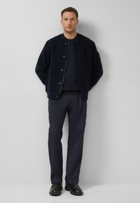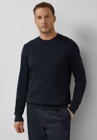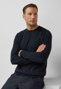 Muž s krátkými vlasy, oblečený v jednoduchém tmavě modrém svetr s kulatým výstřihem a tmavých kalhotách, stojící před světle šedým pozadím.