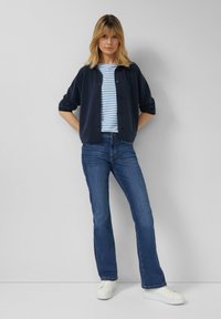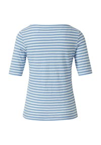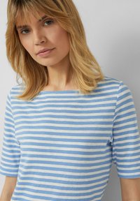 Žena se světlými blond vlasy po ramena, oblečená v krátkém pruhovaném tričku světle modré a bílé barvy a modrých džínách, stojící před hladkou stěnou.