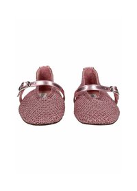 Růžová texturovaná boty typu Mary Jane s metalickým páskem a stříbrnou přezkou, kulatou špičkou a nízkým podpatkem.
