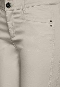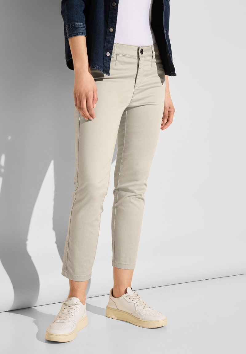 Osoba nosící béžové slim fit kalhoty, bílé tenisky, bílé tričko a tmavě modrou džínovou bundu na jednobarevném světle šedém pozadí.