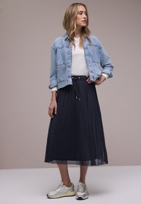 Žena stojící s rukou v bok, oblečená v lehké džínové bundě, bílém tričku, tmavě modré plisované midi sukni a béžových teniskách na jednobarevném pozadí.