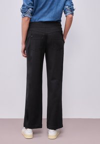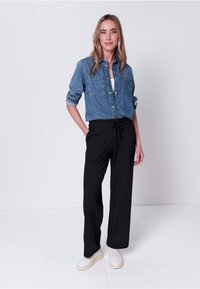 Žena v černých širokých kalhotách s kapsami vpředu, bílých teniskách, bílém topu a modré džínové bundě s ohrnovacími rukávy.