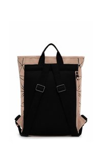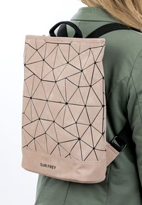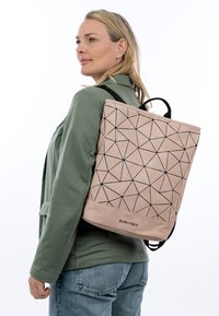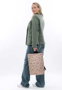 Blondýna v zelené bundě a džínách s nošeným béžovým batohem SURI FREY s geometrickým vzorem, obrácená vlevo na bílém pozadí.