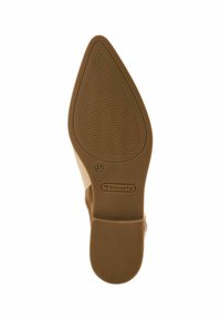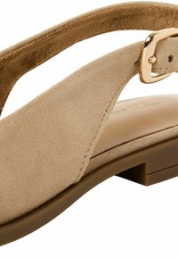 Béžová semišová slingback bota s špičatou špičkou, plochou podrážkou a nastavitelným páskem s přezkou. Hladká textura s minimalistickým designem.