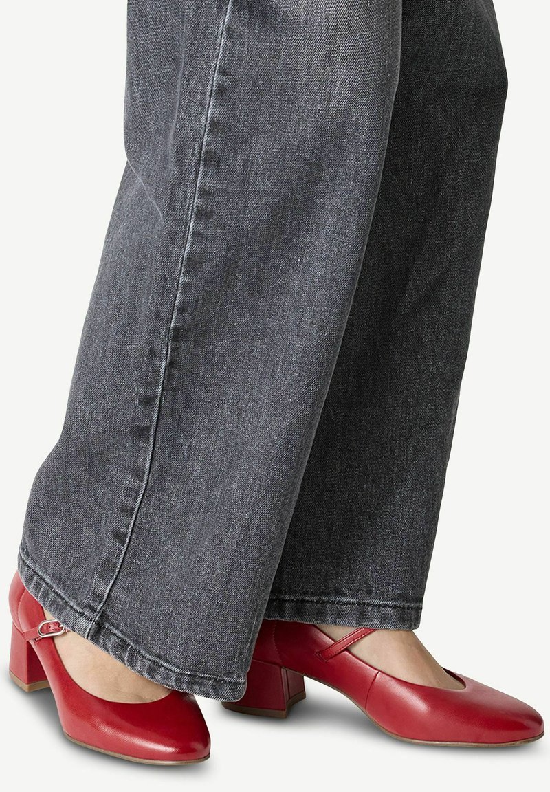 Červené kožené lodičky na vysokém podpatku se čtveratou špičkou a páskem kolem kotníku, v kombinaci s širokými tmavě šedými džíny, které zvýrazňují lesklou texturu bot.