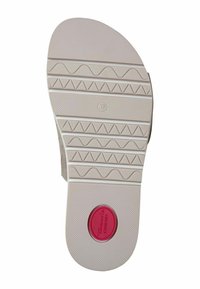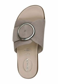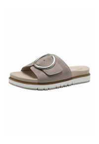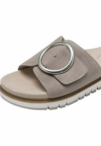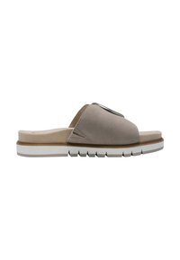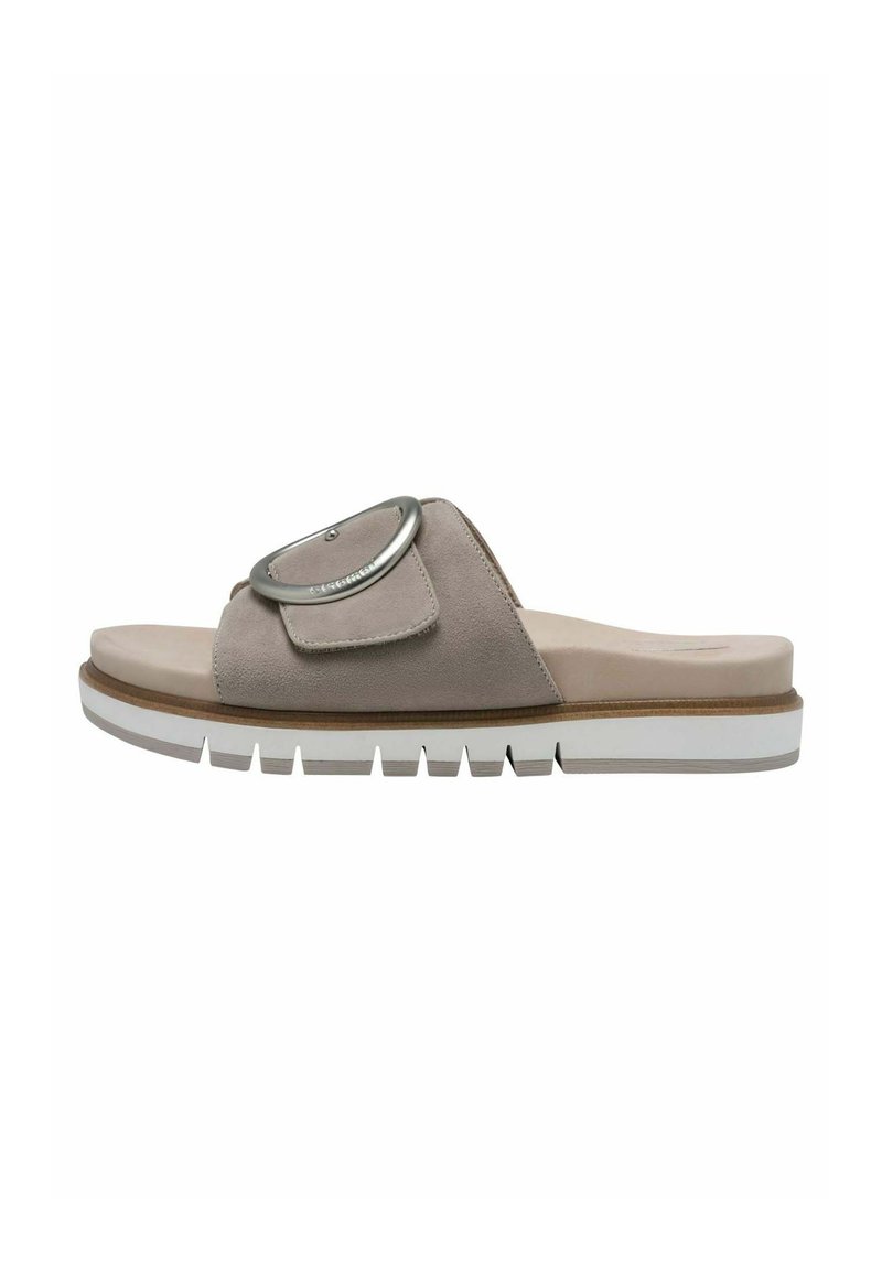Šedá semišová nazouvací sandála s kulatým kovovým akcentem, jednobarevnou skořápkou v barvě třísla a texturovanou bílou gumovou podrážkou. Má nízký profil.
