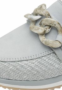 Světle šedé tenisky s tkanou strukturou, ozdobným řetízkem a bílou podrážkou. Kombinované s tmavě šedými rovnými džíny.