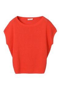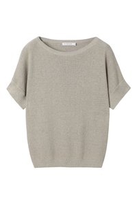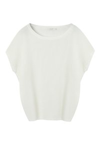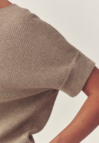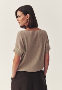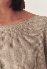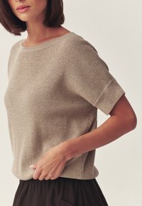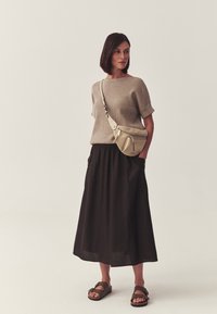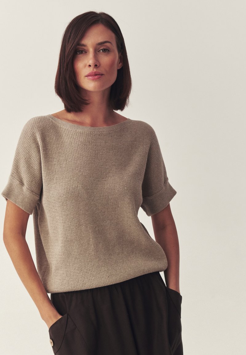 Žena s rovnými hnědými vlasy, oblečená v béžovém krátkém pleteném topu a černých kalhotách, stojící s rukama v kapsách před jednobarevným pozadím.
