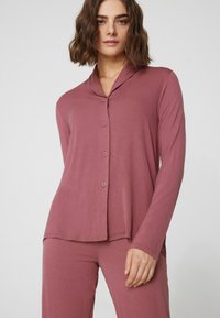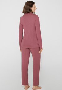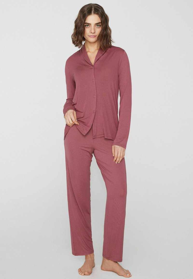 Pyžamový set s dlouhým rukávem a knoflíky v tlumené růžové barvě, vyrobený z měkké látky. Má volný střih a kalhoty s rovnými nohavicemi.